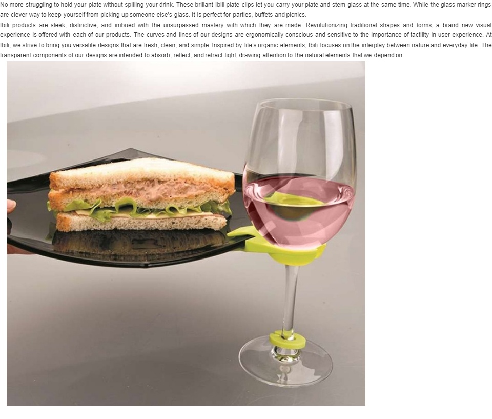 * Plate clips attach to the side of your plate * Glass marker ID rings either clip over the rim of a rock glass or around the stem of a wine/champagne glass * Comes in 6 assorted bright colours * Made in Spain