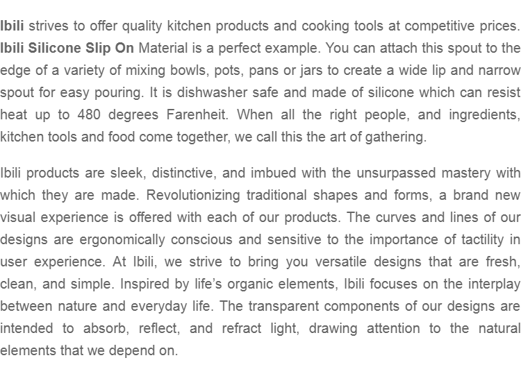 * Size: 11.5 cm * Color: Green * Easily attaches onto most bowls for quick and easy pouring * Heat resistant up to 480 degrees Farenheit * Dishwasher Safe * Material: Made of 100% Silicone