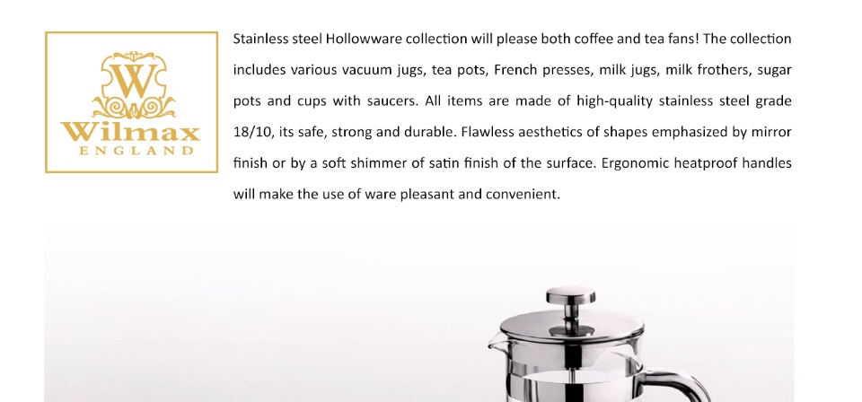 * Dimension (L×W×H) CM: 11.5 cm with handle x 7 cm x 16.5 cm * Item Weight: 0.3 Kg * Capacity: 12 Oz. / 350 mL * Made of High Quality 18/10 Stainless Steel Materials * Mirror Finish Stainless Steel * Durable Wall Insulation * Jug lid with plunger and filter * Heatproof Handle * Absolutely safe for health * Elegant Deisgn * Meant for everyday heavy use * Easy to Clean * Dishwasher Safe and Handwashing Recommended